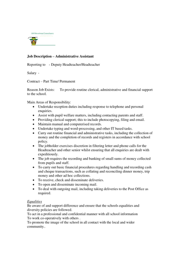 Zety's resume builder will generate hundreds of admin assistant job descriptions as well as suggest bullet points, skills, and achievements. Administrative assistant duties and responsibilities. Nb this job description is proved to assist the post holder to know their principal duties. Administrative assistants prepare documents, schedule appointments, and maintain files. Admin assistants perform clerical duties in nearly every industry.
